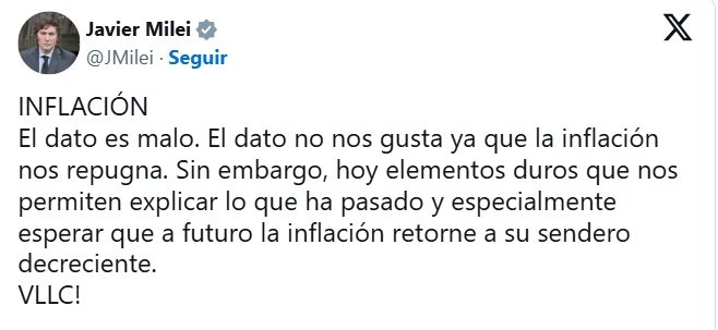 “El dato es malo”, posteó Javier Milei. “El dato no nos gusta, ya que la inflación nos repugna. Sin embargo, hoy elementos duros que nos permiten explicar lo que ha pasado y especialmente esperar que a futuro la inflación retorne a su sendero decreciente”, dijo el Presidente en su cuenta de X.