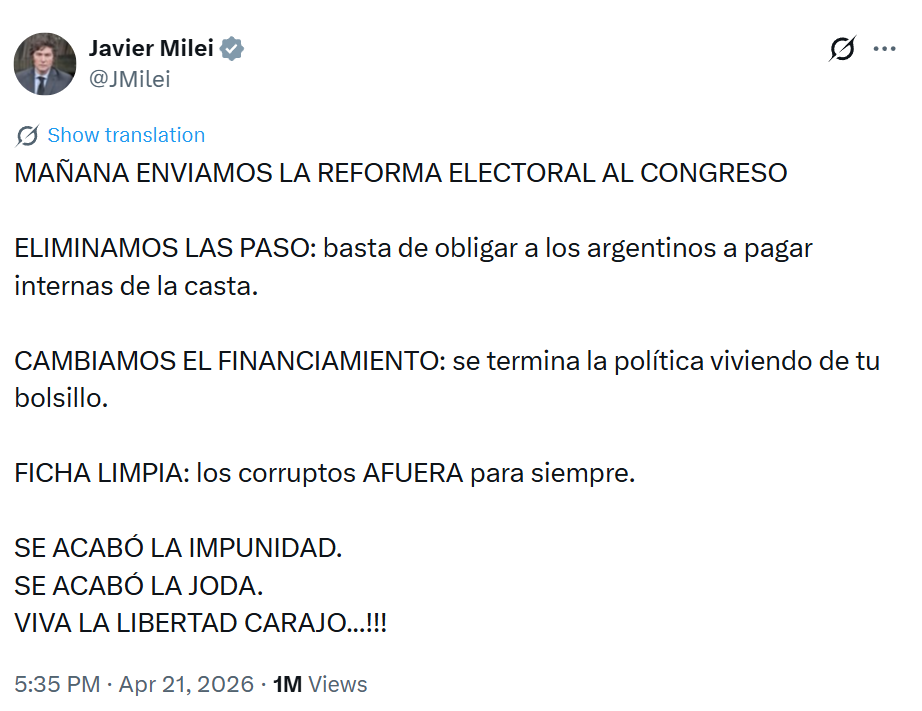 El presidente Javier Milei anunció que el Gobierno enviará al Congreso un proyecto de reforma electoral que propone cambios profundos en el sistema político argentino, con el foco puesto en la eliminación de las elecciones primarias, modificaciones en el financiamiento de los partidos y la implementación de la denominada “Ficha Limpia”.